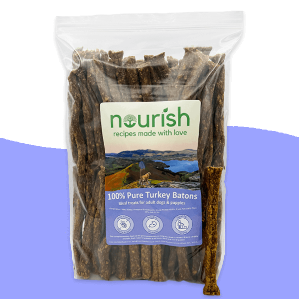 • nourish's poultry training treats for dogs contains 80% Chicken, Duck & Turkey for your dog to enjoy. These Bones shaped crunchy treats contain no added synthetic flavouring or colourants and are grain free.     See more benefits