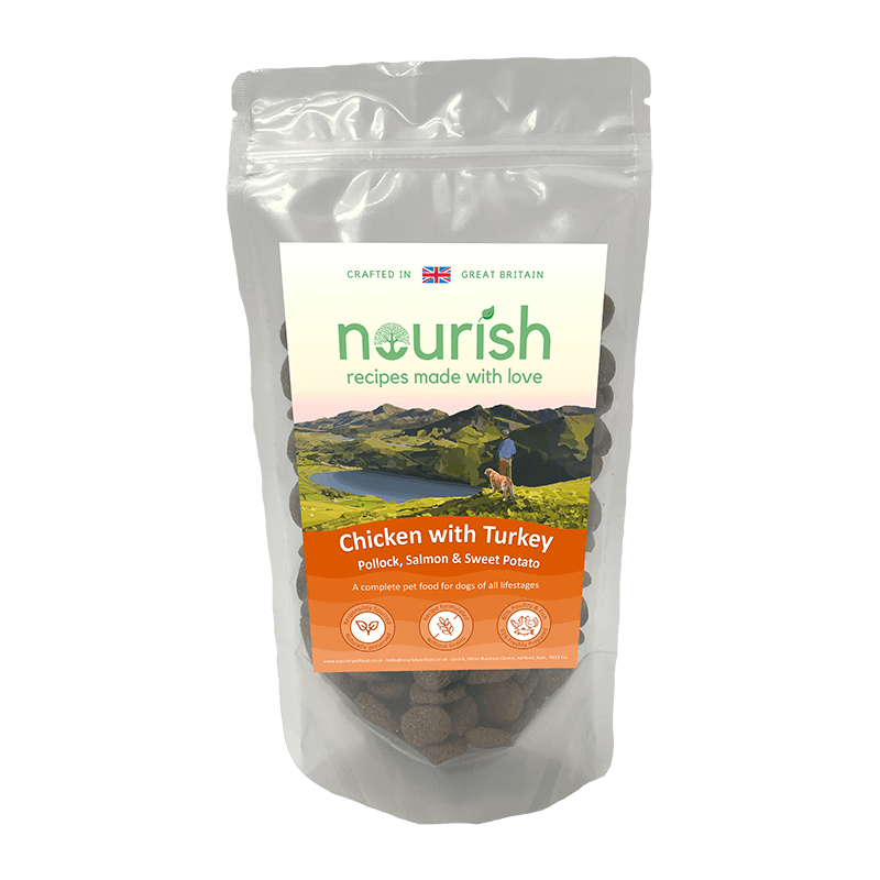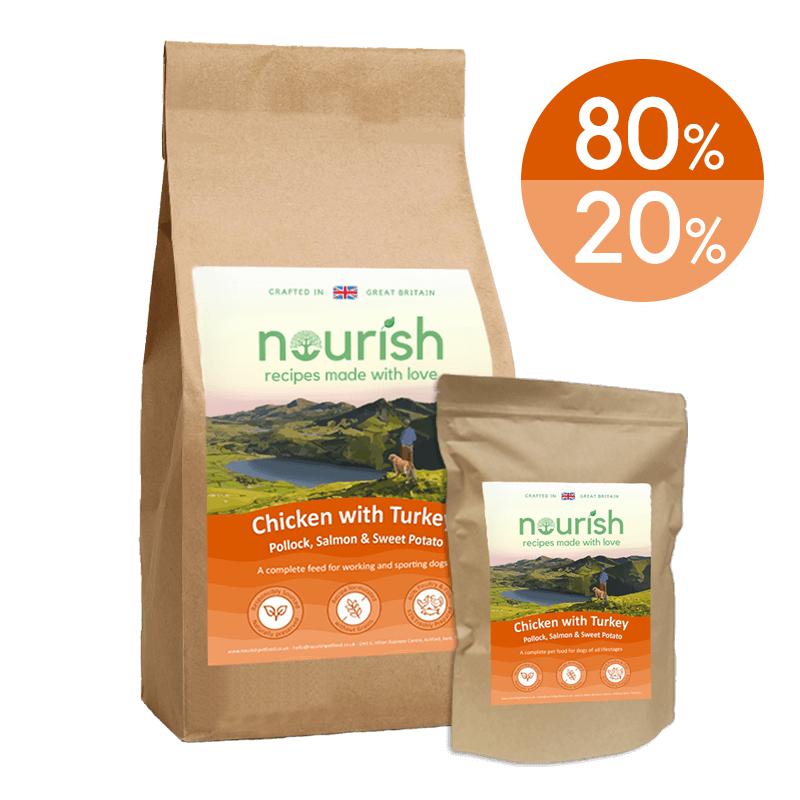 Nourish’s 80/20 Chicken with Turkey, Pollock, Salmon & Sweet Potato Dog Food for all lifestages is nutritionally balanced and packed with wholesome ingredients. Cooked to perfection from a recipe containing no wheat, pork or dairy products. Ideal for moderate, active and working dogs.